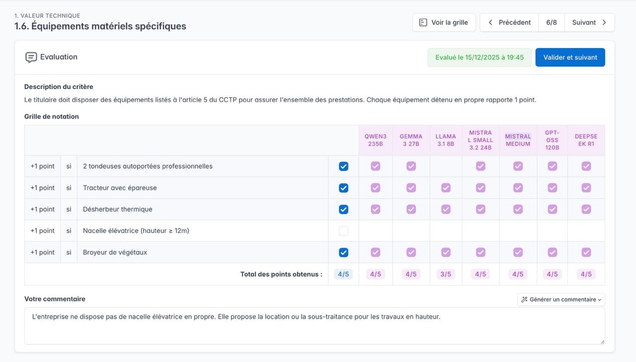 - Petits modèles de langage : adaptés aux tâches simples et bien définies (sélection, extraction, classification, notation), les petits LLM privilégient la rapidité d’exécution, la maîtrise des coûts et une empreinte environnementale réduite. Par exemple, “mistral-small” suffit pour suggérer une note sur un critère à partir d'un commentaire détaillé et d'un barème précis.