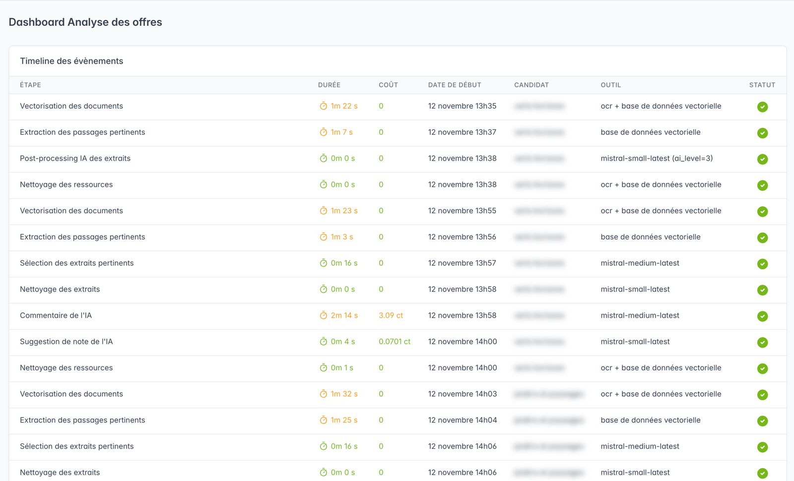 La séquences des toutes les tâches IA est spécifiquement suivie, de telle sorte qu'on puisse apprécier la performance globale de la configuration étudiée, et identifier précisément le coût et la durée d'analyse d'un mémoire technique type.